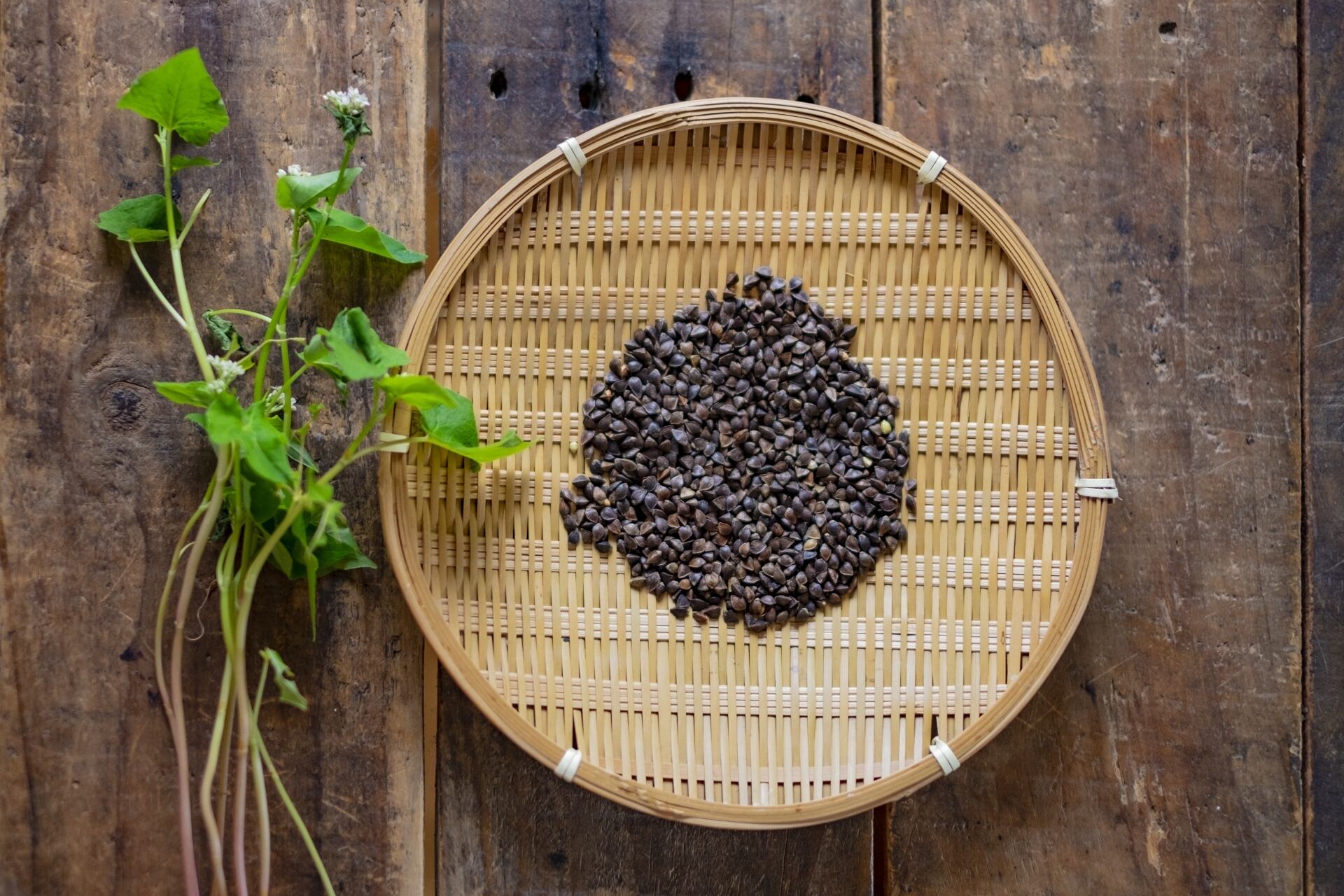 佐賀県で育まれた良質のそばの実を使用しており、農薬・化学肥料を使用せずに育てているので、安心してお召し上がりいただけます。また、すべてを「丸抜き加工」せず、敢えて玄蕎麦(黒い皮付きの蕎麦の実)と混ぜることで蕎麦の香りを強く残すようにしています。